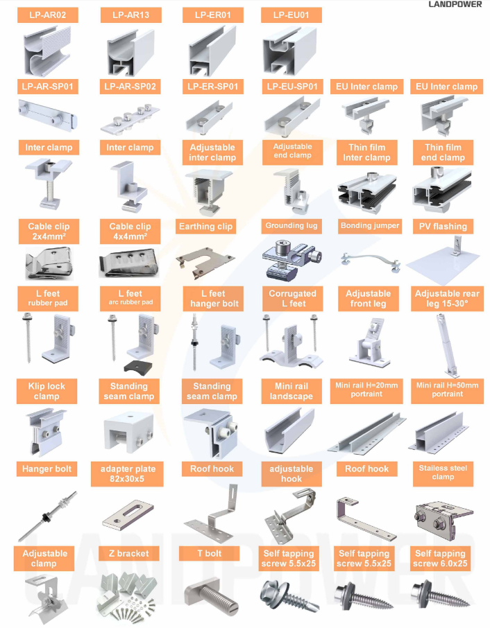 we carry a full suite of solar mounting accessories — from rails and clamps to roof hooks and L-feet.
