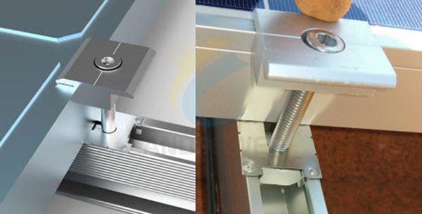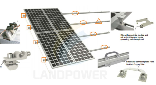 Landpower Earthing(grounding) System ensures solar pv system grounding up, our specially design mid/end clamp ground clip with sharp point on four coroners to destroy anodized film from rail and solar panel frame, which making the panels and mounting rail become a conduction circles.In addition the bonding jumper connected between two rails and the earthing lug holding the copper wire to connect different row of rails, which turn the whole solar pv system into conduction systems. Finally grounding the systems via copper wire.